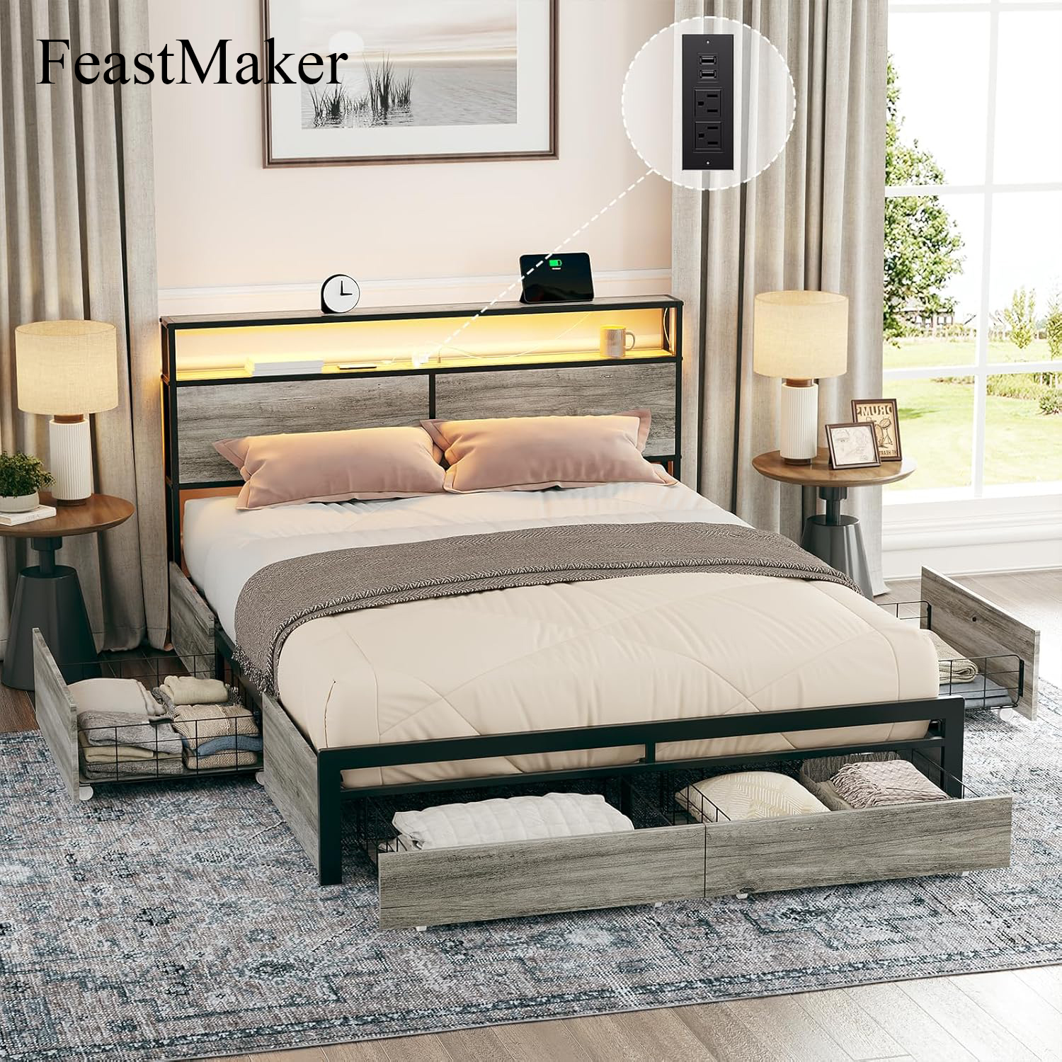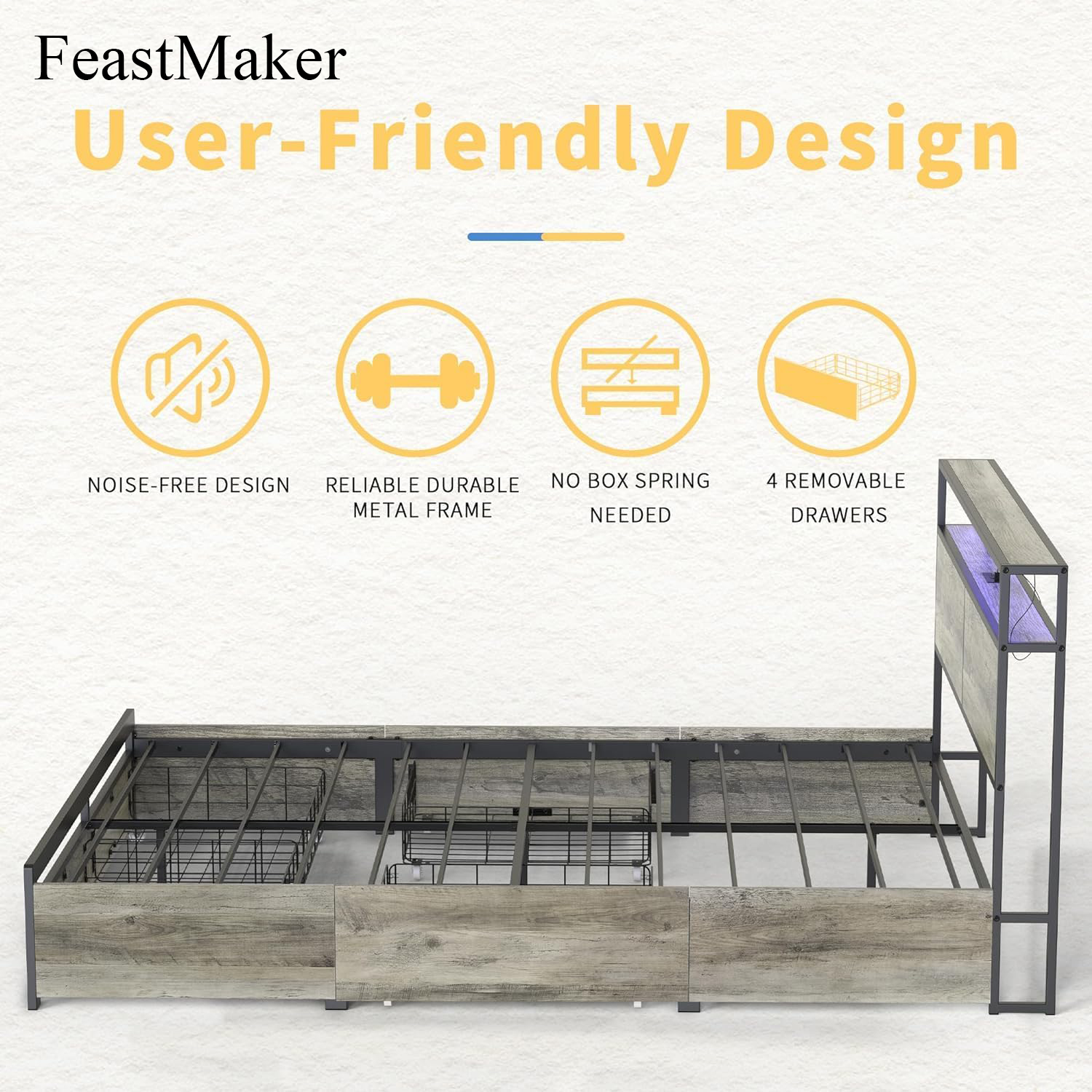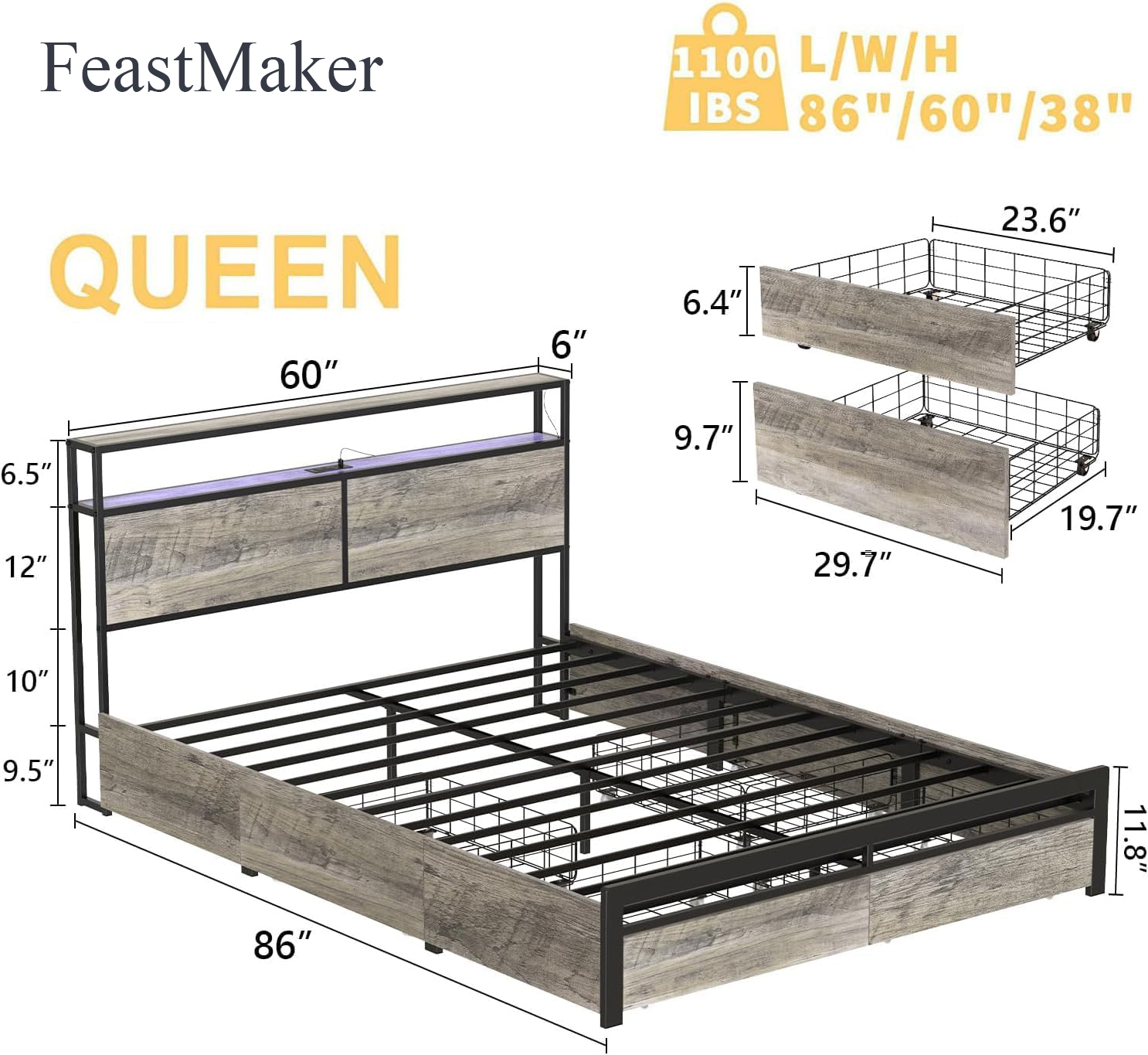 Smart charging center and mood lighting system: The double bed frame enhances convenience. It is equipped with dual AC sockets and USB ports on the headboard, providing bedside charging for mobile phones, tablets and laptops without leaving the bed. Transform your space with 20 vibrant static colors and 22 dynamic LED modes – from the serene glow of a sunset to the vibrant party flashlights. The brightness, lighting effects and schedule can be easily controlled with the included remote control, while the reinforced metal slats offer silent, anti-slip support for continuous relaxation